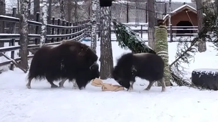 В Красняорске в парке флоры и фауны «Роев ручей» сняли умилительное видео, как подросший теленок овцебыка Таймыр играет со своей мамой Галюшей посреди зимнего вольера.