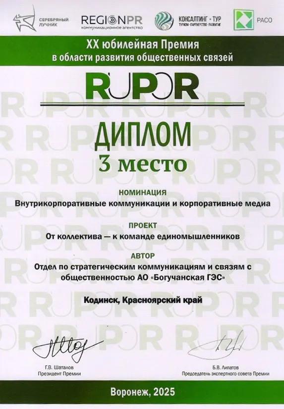 Проект Богучанской ГЭС «От коллектива – к команде единомышленников» занял III место в номинации «Внутрикорпоративные коммуникации и корпоративные медиа» ХХ Премии в области развития общественных связей RuPoR. Проект, подготовленный Отделом по стратегическим коммуникациям и связям с общественностью, представил на суд жюри итоги марафона «Энергичная команда». В мероприятиях, организованных коллективом в 2024 году, приняли участие практически все сотрудники станции и многие члены их семей.