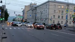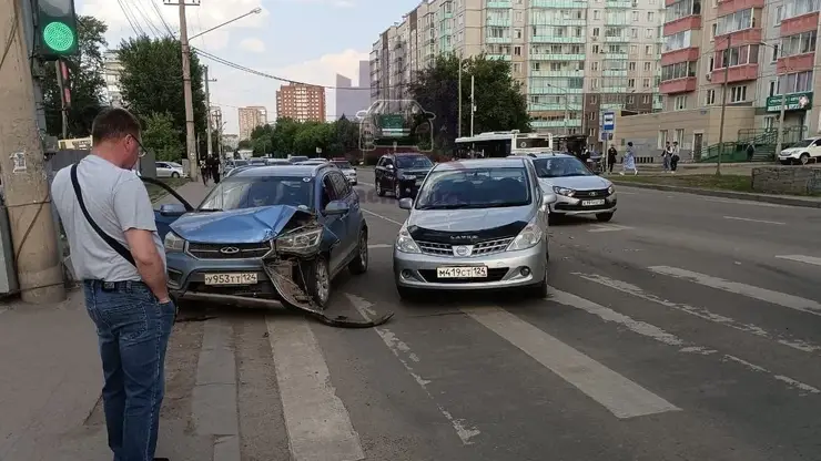 Три машины столкнулись на пешеходном переходе в Красноярске. Прохожий пострадал (видео)